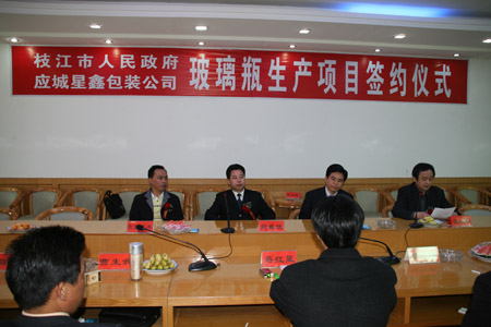 4月8日,枝江市市長劉建新與應城市星鑫包裝有限公司董事長胡志雄在枝江酒業(yè)行政大樓多功能廳簽下高檔精白料玻璃瓶項目投資協(xié)議。宜昌市委常委…